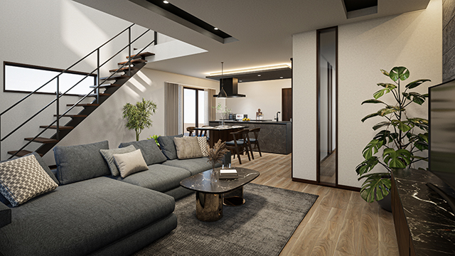 - 吹き抜けリビング:自然光が豊富に入る開放空間。黒アイアン階段をアクセントにしたモダンな演出。